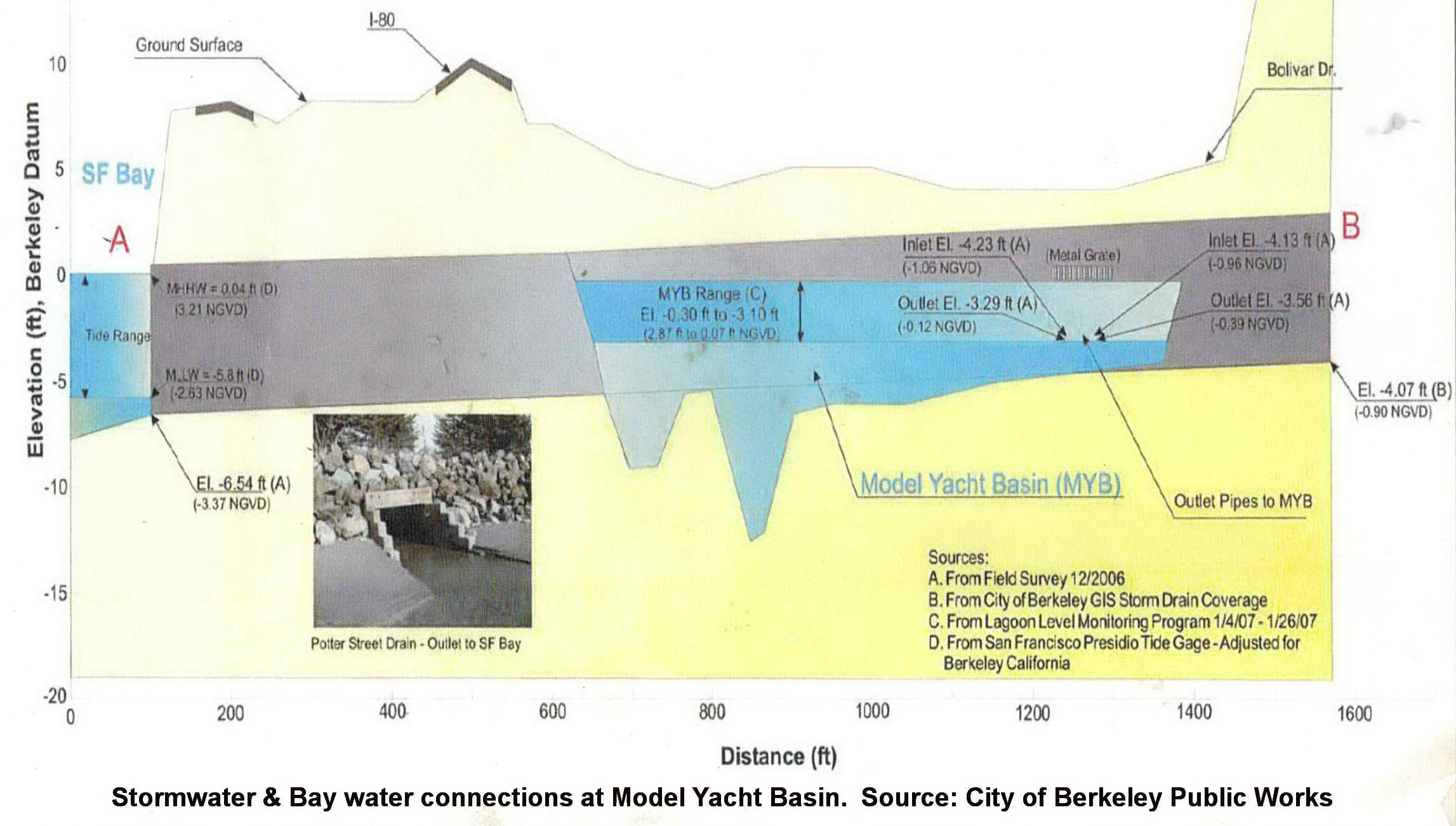 The pipe’s aim was to intercept the polluted runoff from industrial West Berkeley, sending it to the Bay via the Potter Drain instead of Aquatic Park’s lagoons. This meant that some of this pollution was bound to wind up in the Model Yacht Basin via the Potter Drain openings there.